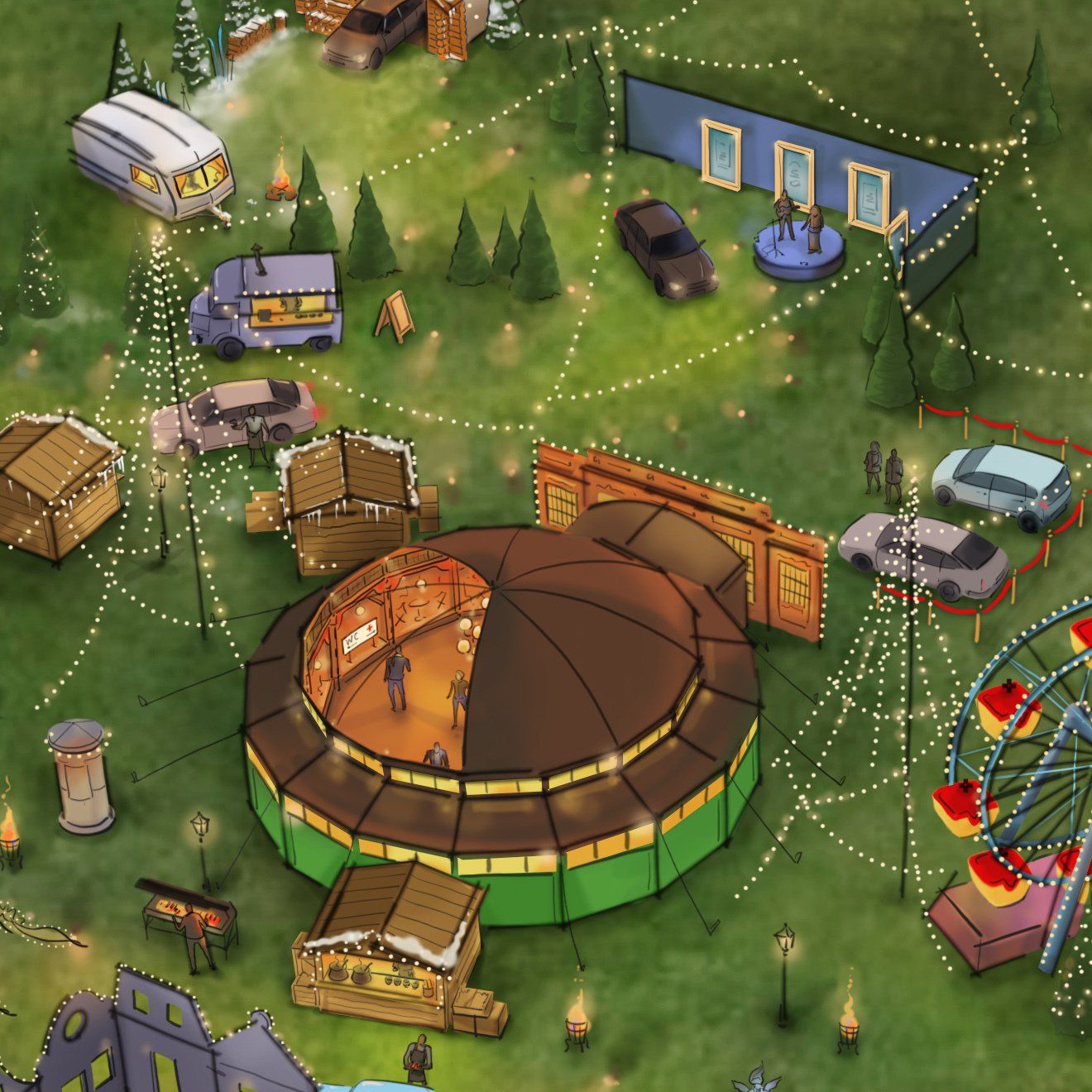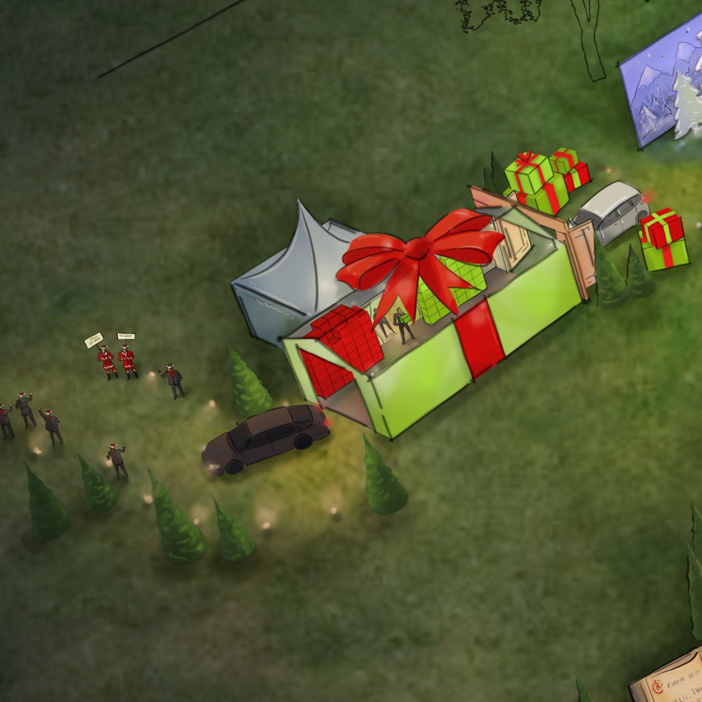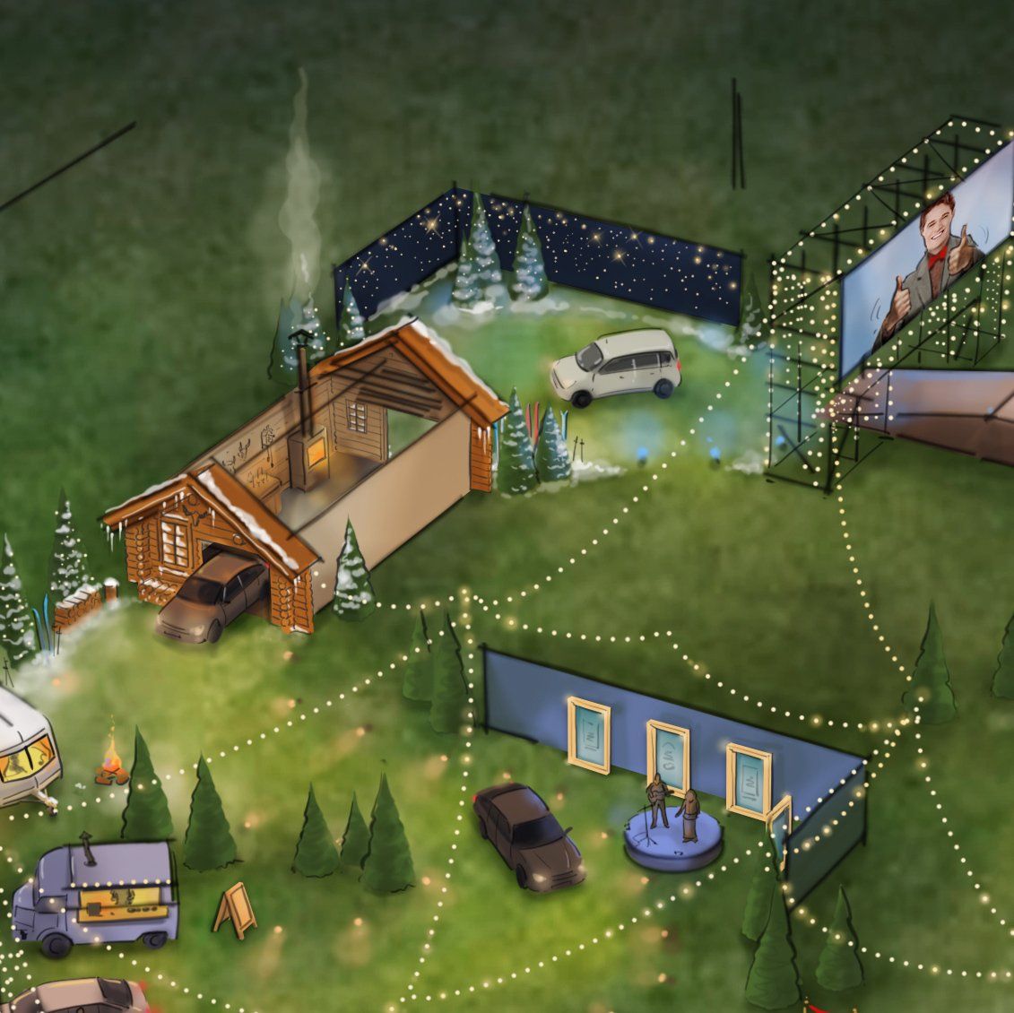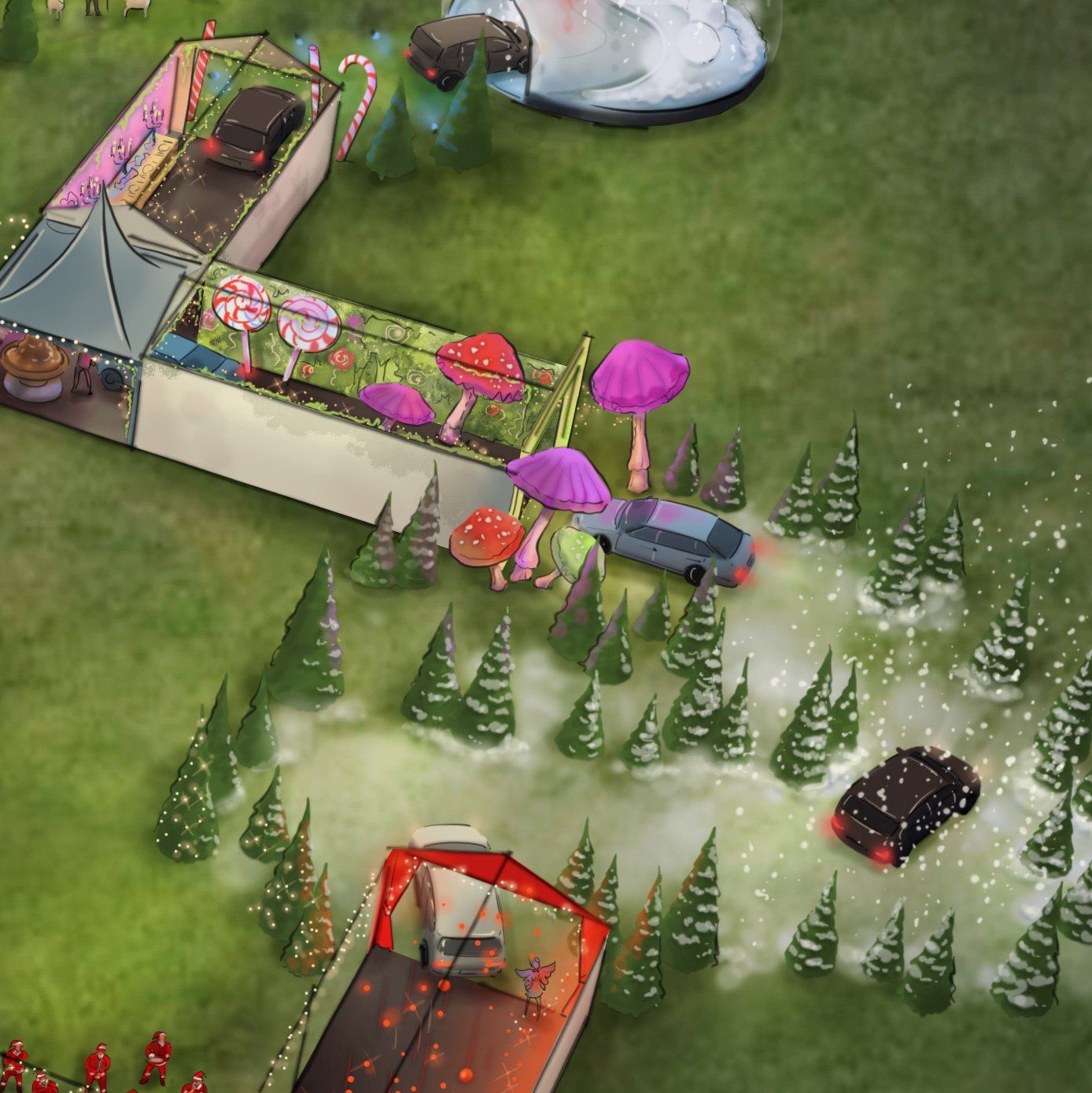 Drive'n December is een mobiele attractie die tijdens de feestmaand bij jouw bedrijf op het terrein staat. Je medewerkers, je relaties en hun gezinnen rijden of wandelen dan door een prachtig Winterwonderland. Onderweg beleven ze wonderlijke avonturen en ontmoetingen. Willy Wonka deelt chocolade uit en de directeur dankt de medewerkers voor hun inzet. Laat in de levensgrote sneeuwbol de zachte vlokken landen op je huid en drink Glühwein in de après-skihut.